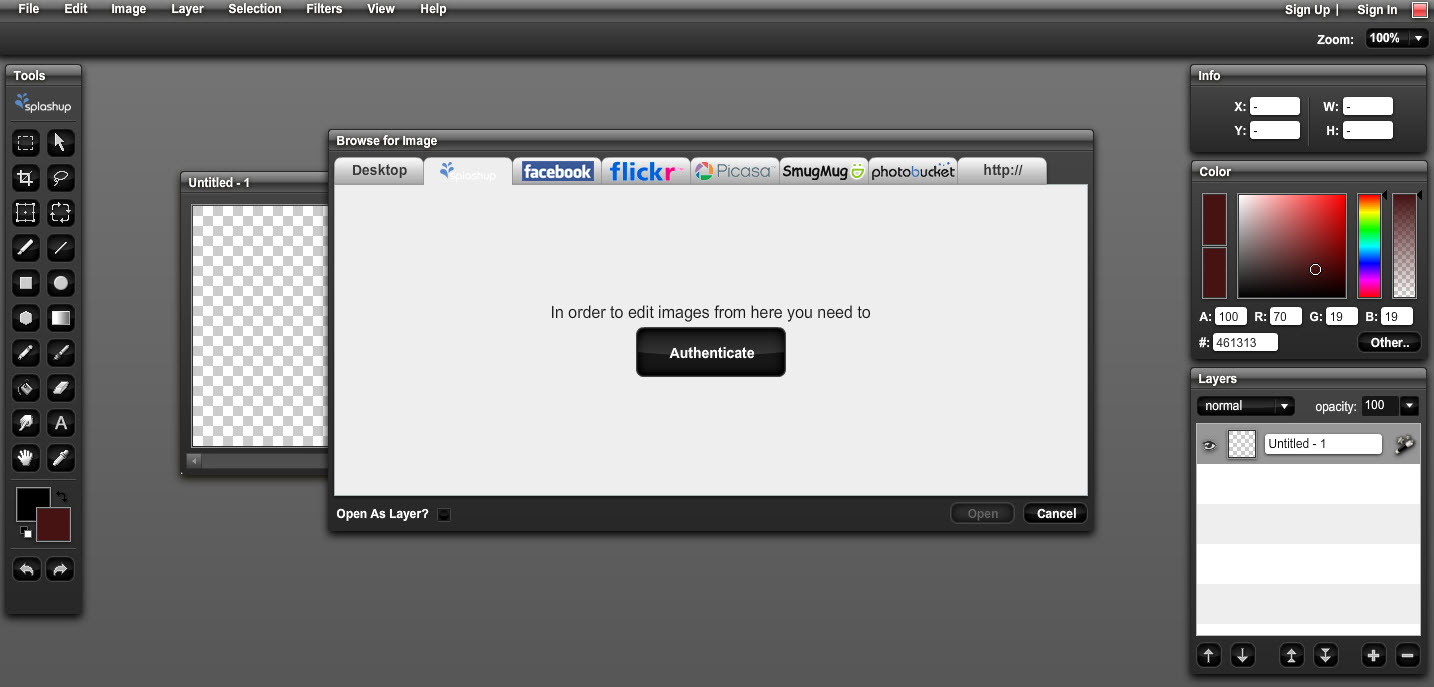 Splashup is the only full-featured, free range, image editor online. Create new images, edit existing images and manipulate layers with filters, layer effects and brushes almost every feature of Photoshop will be available in this Online tool. This is the home page of Splashup. You are also given provision to use Splashup Light which is lighter version and is compatible of running on any computer as well as your mobile PC’s.