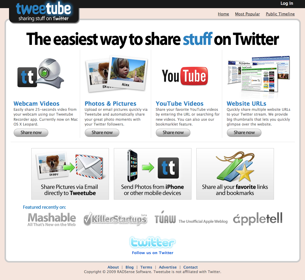 TweeTube : TweeTube is online as well as  iPhone application that lets you to share pictures, videos, bookmarks and other stuff on Twitter. At the site you can see easily share 25 sec Webcam video(this is only meant for Mac OS X). In order to share click on the service which you are going to use. enter the information, give your twitter name and password and then click on share.