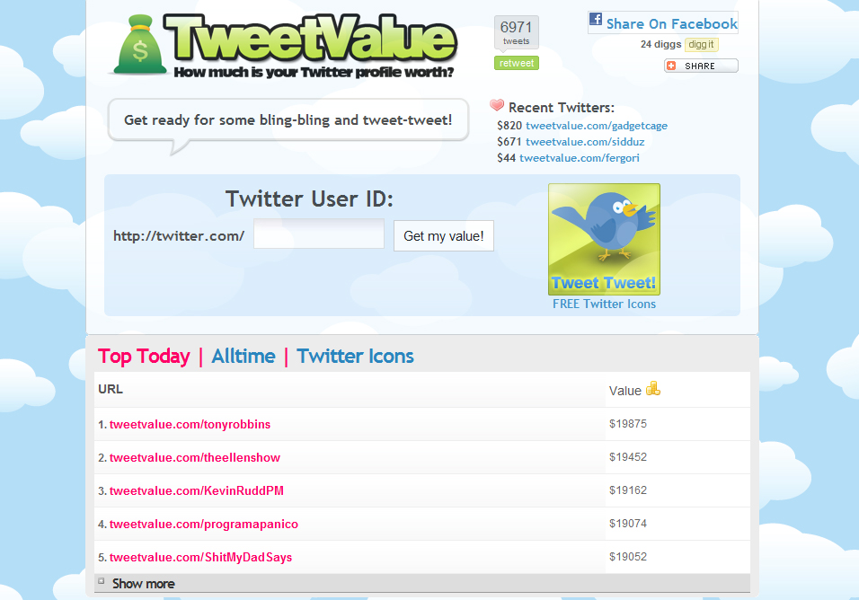 TweetValue : TweetValue is a recently launched Twitter application that tells the Twitter users, how much their profile is worth. Its pretty easy to use it. Just type your username of Twitter. Then it will display you profile worth.  You can also display the worth of your Twitter profile by using the nifty badges on your webpages.