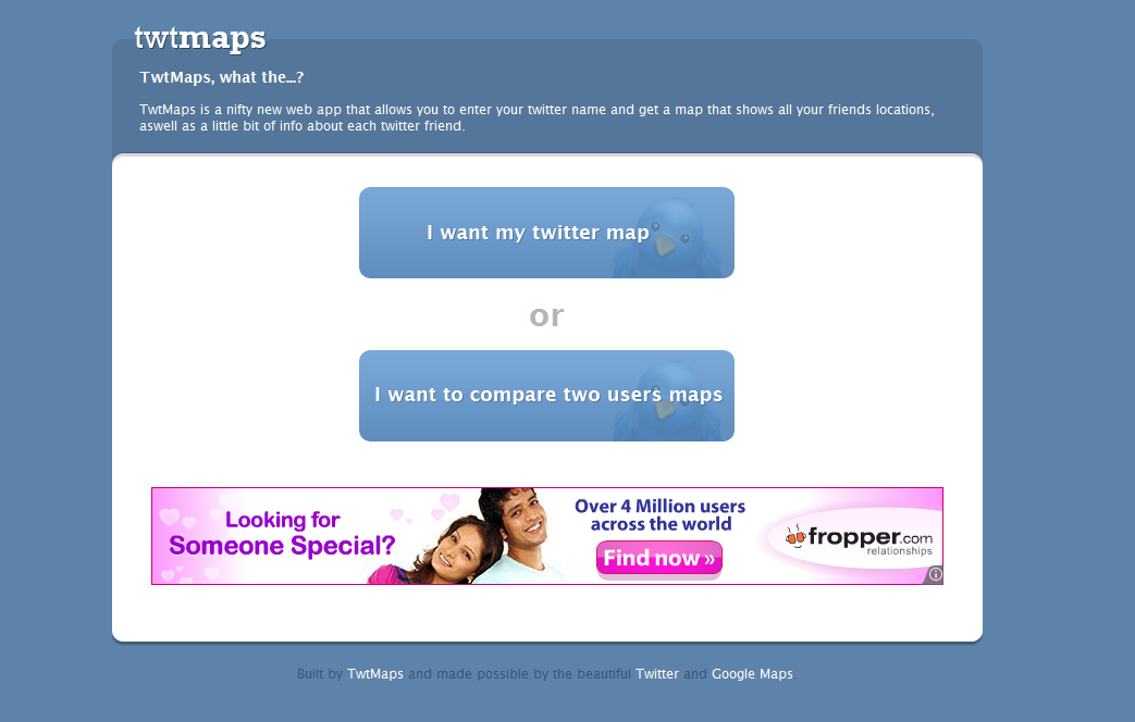 Twtmaps : Twtmaps is a new application that allows you to enter your username that gives the map that shows all you friends locations as well as little information about your friends. You were also given provision for multiuser search also.