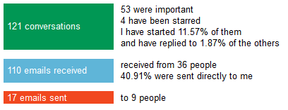 - Volume statics shows the number of starred & important message, how many mails you received, number of people send you emails, what percent of them are directly sent to your inbox and how many email you sent.