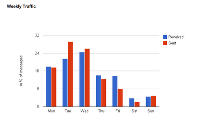 Gmail Meter is a useful service that helps you get to know statistics about your Gmail account. This tool shows information like how many emails a month you get or send,on which day you send more emails, how many contacts send you emails, who were the top 10 contacts who sent your emails, top 10 recipients, top threads, what was the send/receive ratio, number of people who sent you email previous month and so on.