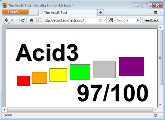 Firefox scored 97/100. This was again not surprising as earlier versions have done decently in the Acid3 tests. Considering Firefox 4 is still beta and has not released the final version, we might see a lot more improvements.