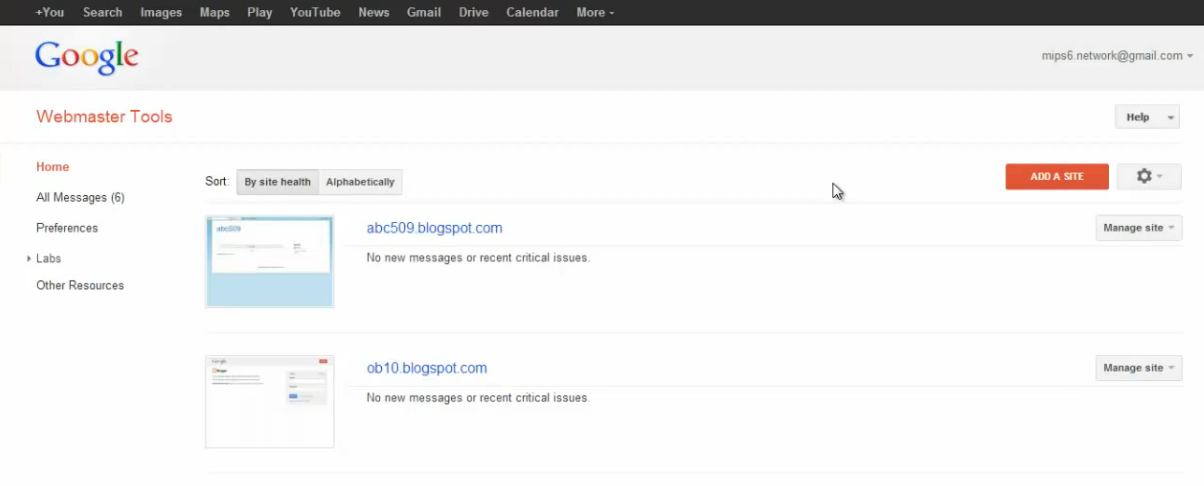 - Once the Webmaster site opens you can see your blog address as in the figure below. If it is not there press ‘Add URL’ or ‘Add Site’ button and add address of your blog. Now click on your blog address.