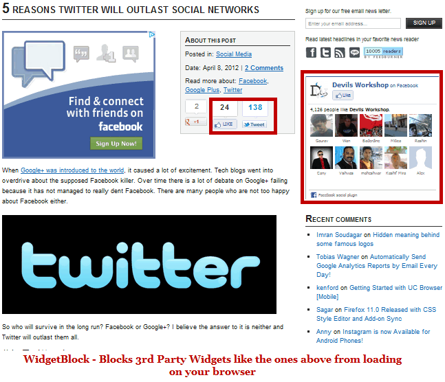 Unfortunately not all blogs are into minimalism and often have many 3rd party widgets on their website. But Chrome has a handy extension which allows blocking all 3rd party widgets on a page you look up with the browser.
