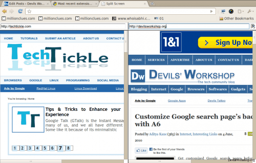Split Screen is an extension for google chrome that lets you browse two websites within a single tab of your browser. The extension splits your browser into two windows, where you can separately enter url’s and surf effectively. This extension can be really helpful on wide screen monitors, which will give you endless real world uses.