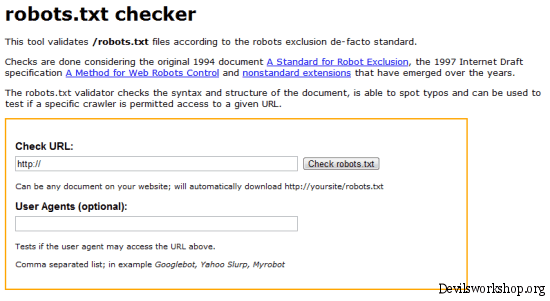 - A web robot or web crawler which first visits a website it looks up for the robots.txt files. For example when a search crawler looks up https://devilsworkshop.org it will look up for https://devilsworkshop.org/robots.txt.