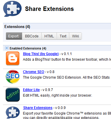 Share Extension is a very good extension for Chrome browser. With this extension we can share the extensions in Chrome Browser. It allow you to share BBcode , Html code , Wiki, Text for any of the extension you have installed on the Chrome. 🙂