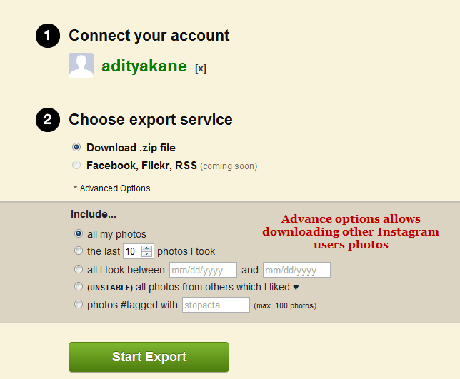 The advanced options allow users to download all your photos, photos from a specific time frame and even all the photos you liked from other users. It also allows downloading upto 100 Instagram photos from a particular tag.