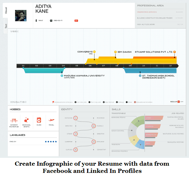 Visit the website Resumup.com and allow it to use your Linked In or Facebook profile information. Within seconds it creates an infographic styled graphical presentation of your timeline as far as work experience is concerned. You can also edit various elements on the presentation and customize it further.