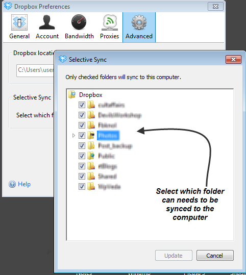- The new feature out here is the Selective Sync. This allows selecting only certain folders from being Synced. Just look up “Selective Sync” in your Dropbox preferences.