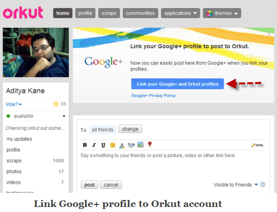 Login to your Orkut account and ideally you should see the option to link it with your Google+ account as seen in the screenshot above.
