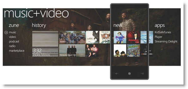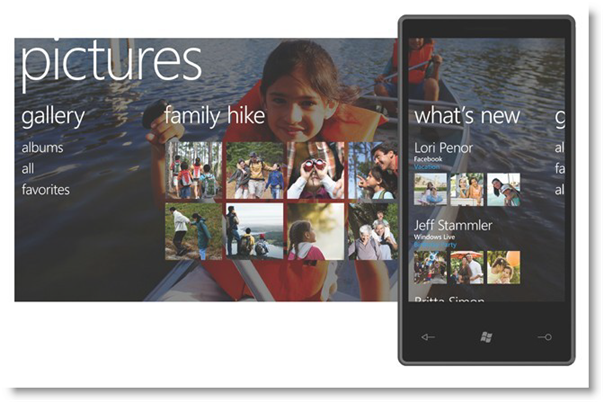 - Pictures- Bringing together a user’s photos by integrating with the Web and PC, making the phone the ideal place to view a person’s entire picture and video collection.