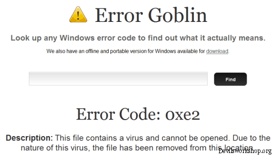 - As you can see in the image above I had checked out what Error code 0xe2 meant. It correctly shows that the file contains a virus and cannot be opened.