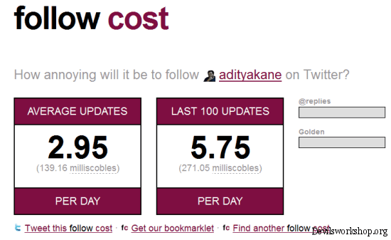 - Follow Cost calculates and displays the number of Tweets per day on an average and also displays the number of Tweets per day for the last 100 Tweets.