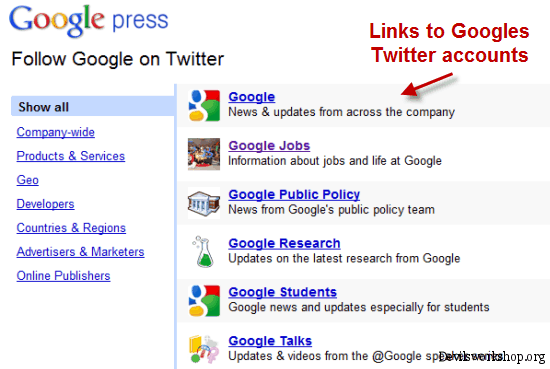 Google has a landing page which lists all their Twitter account. All these Twitter profile accounts are neatly organized under Company Wide, Products and services, Geo, Developers, Countries and Regions, Advertisers and Marketers and Online Publishers.