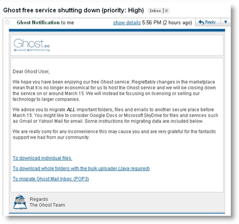 Early morning, I received an email from them stating that Ghost would be shutting down its free service. The news came as a shock for me as I have been using their service for more than a year now. They are the best web based OS providers and the hosting space has no limit since you can earn it by inviting friends to use this service. The contents of email are-