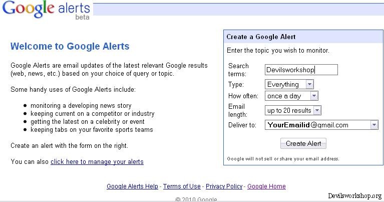 • Sign in to your Gmail account and then go to http://www.google.com/alerts.