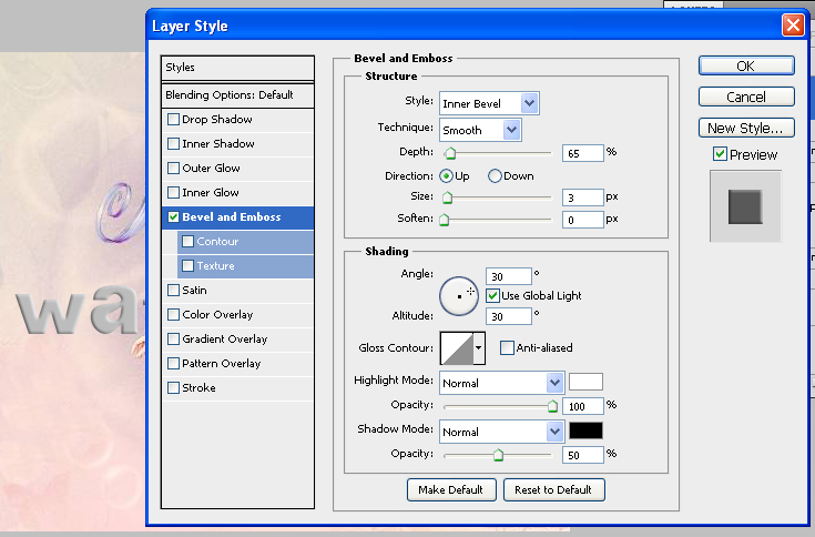 After that you can see Layer Style pallet displayed on your screen. Keep your settings like I have in the image below. Just apply only Bevel and Emboss effect.