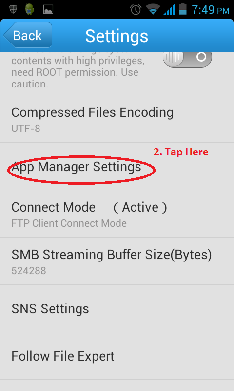- Fire up the File Expert app. Just at the bottom of the home screen you will see a pull-up tab. Touch on it and you get few more options. Touch on ‘Settings’.