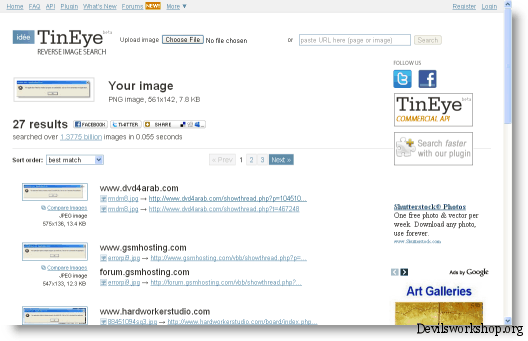 Have a look at the Cool Searches page on their website for interesting user searches. To know more about TinEye, read their faq section. The search engine can be used from browser, without visiting their website, using TinEye browser plugins. TinEye Website.