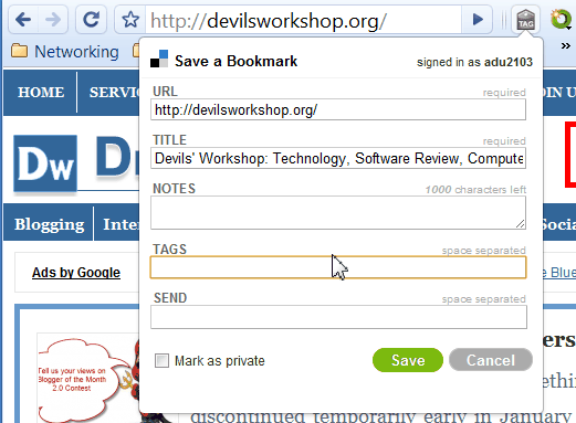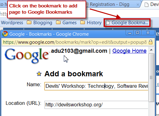 Google Bookmarks is relatively unknown compared to delicious but it also allow bookmarking websites online. I use this sometimes to save up interesting Google related links. This is not actually a extension but a bookmarklet. Just visit the Google Bookmarks add a bookmark page and drag and drop the bookmarklet on your Chrome browsers bookmarks section. When you like a page and want to add it to Google Bookmarks just click on the bookmarklet and add the details you want with the page as shown in image below.
