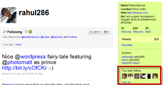 - I follow @rahul286 and when I click on his twitter page, I can now see common accounts the both of us follow. (see above image)
