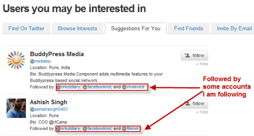 As you can see in the image above that some accounts show up as ones which I might be interested in following. It also shows other Twitter users who I follow are following this suggested account. 😉