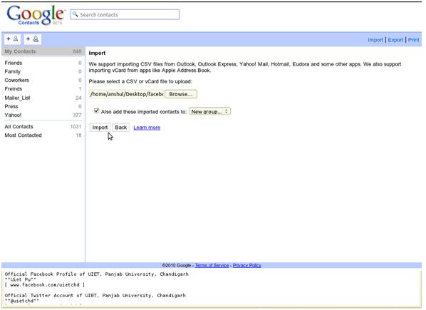 - Now point your web browser to http://www.google.com/contacts/ .Sign in with your desired Google Account and select Import. Browse to the facebook.csv file and click on Import.