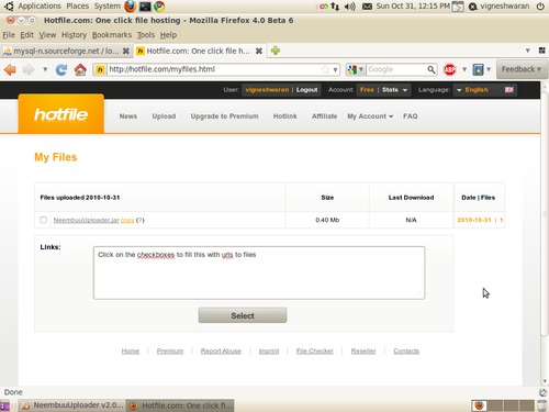 In the above ubuntu screenshot, I had dragged and dropped a file and uploaded into my Hotfile account. If I check my Hotfiles account in my browser, my file is there. 🙂