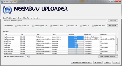 Neembuu Uploader is a batch uploader application that lets you upload your files just by right clicking on them and simultaneously to multiple file hosts and manage download links and delete URLs.