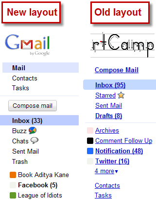 - The new layout bring about a change in focus. I guess many Gmail users might not have been aware of the Tasks features and also struggled a bit to find contacts. New layout makes a user plainly aware of Mail, Contacts and Tasks.