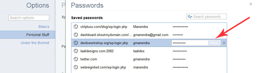 - Clicking on the password, we get an option asking you to “show” the password. This is useful if you have forgotten your password but have it saved on your browser.