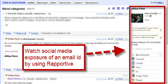 Most people use their email address to register to social networks like Twitter, Facebook and Linked in. Rapportive is a awesome online tool which shows relative information corresponding to the email id. (see image below)