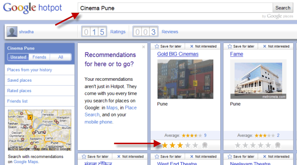Google Hotpot gives you an interface with which you can rate, review and seek recommendations for local services like – Restaurants, Cinemas, Hospitals, etc.
