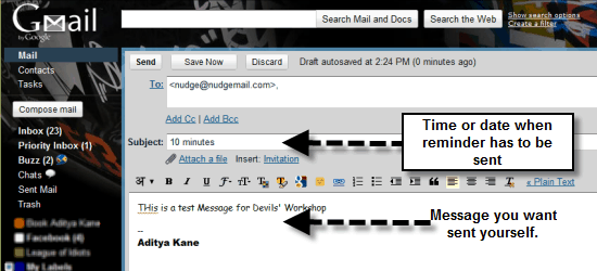 - In the subject type in when the reminder has to be sent. I typed in 10 minutes and I received a reminder in 10 minutes. I could also send reminders with subject line as “Tomorrow“, “Nov 20” and more.