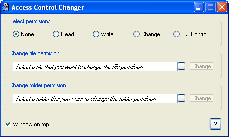 Access Control Changer is a freeware utility that allows you to change file permissions of any file or folder allowing you to read-write, change or take full access over the file or folder. From the application UI, select the file or folder for which you want to change the permissions, click change and click ok for the confirmation of the change. You get the desired permissions set for your folder!
