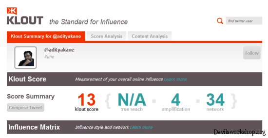 Once you stop being the naive blogger and get a little smarter you make sure you have a Twitter account and get active on it to reach out to the world with links from your blog. So now one thing is to find out how influential you are on Twitter.