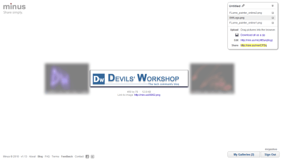 - Gallery Editing: Min.us generates an ‘Edit’ URL, which when shared with viewers allows them to add or delete images from your gallery.